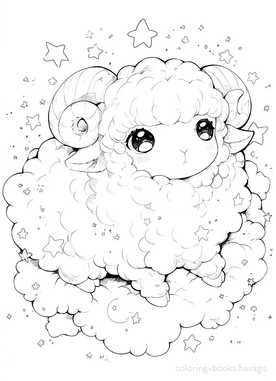Sheep coloring page looking at the night sky from a cloud.